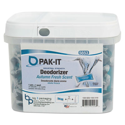 Simply drop one pre-measured deodorizer PAK-IT® into its matching quart trigger spray bottle (sold separately) and add cold, tepid or warm water. Wait two minutes and shake. Adjust nozzle to mist setting and spray liberally. This economical and highly effective solutions kills odor causing mold and bacteria at the source. The fragrance will linger only for a little while then taper off to neutral. Ideal for persons with allergies or sensitivities to strong fragrances. Each PAK-IT® yields 32 ounces. Scent: Autumn Fresh